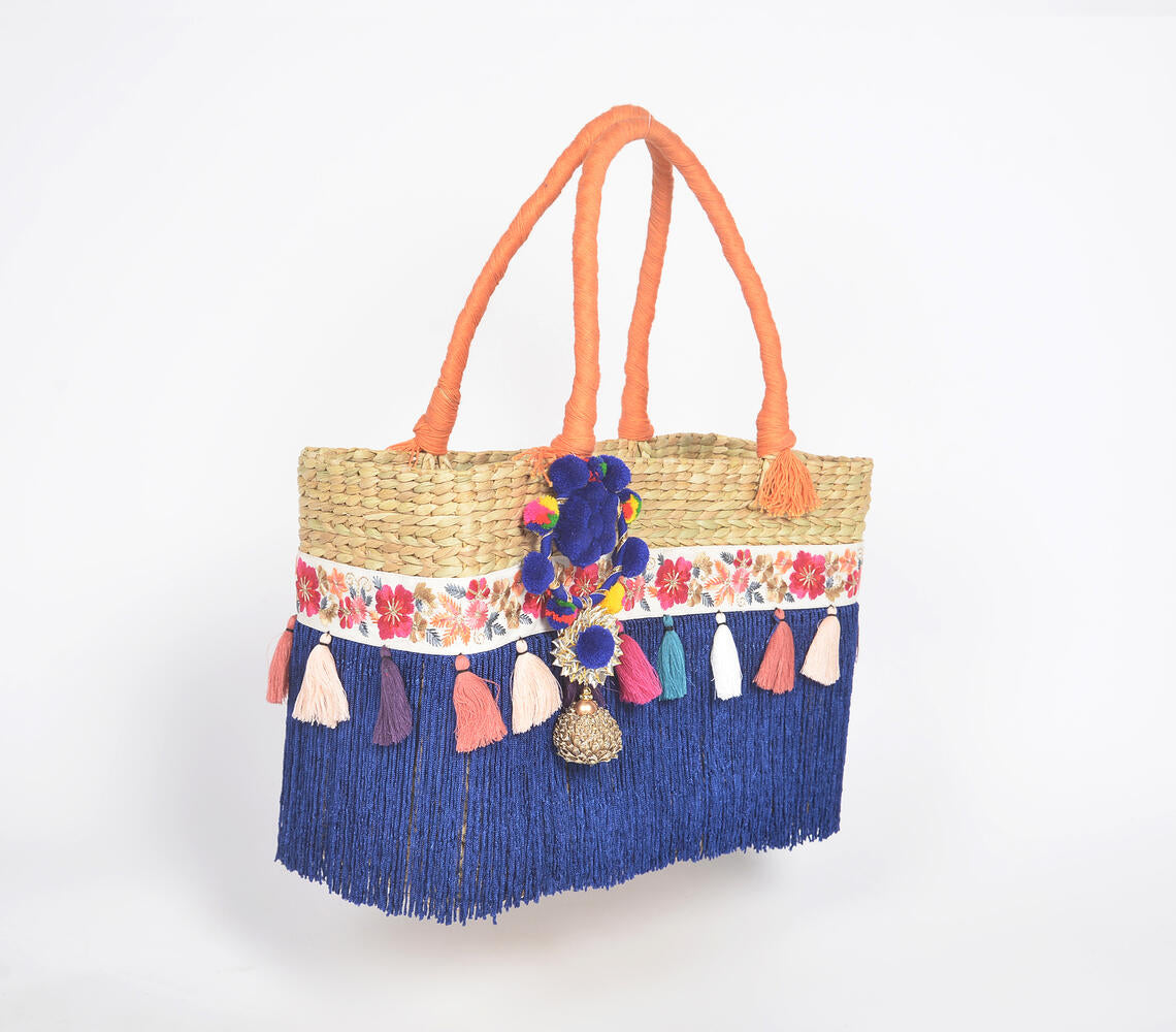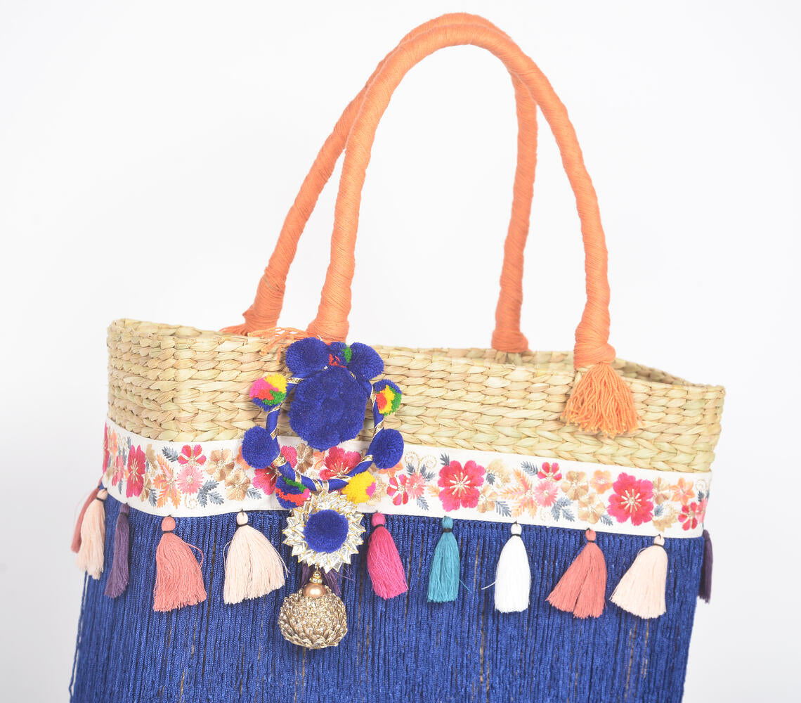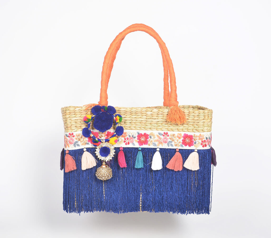 Tasseled Basket Woven Cane Indigo Handbag