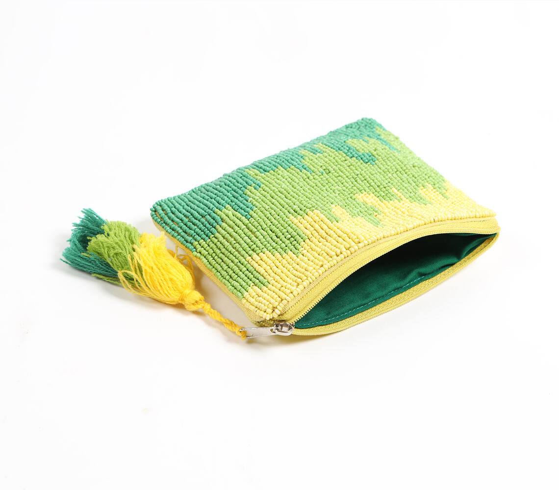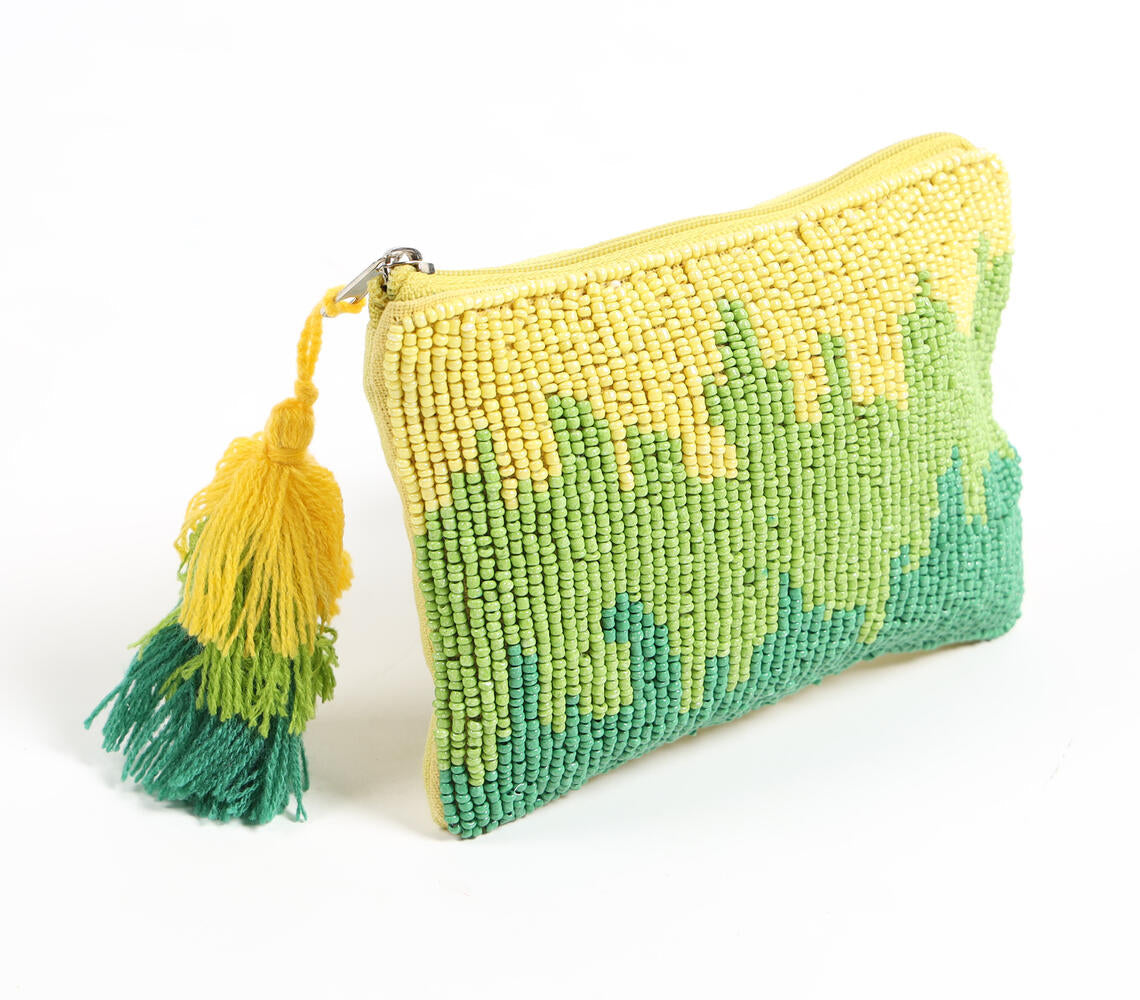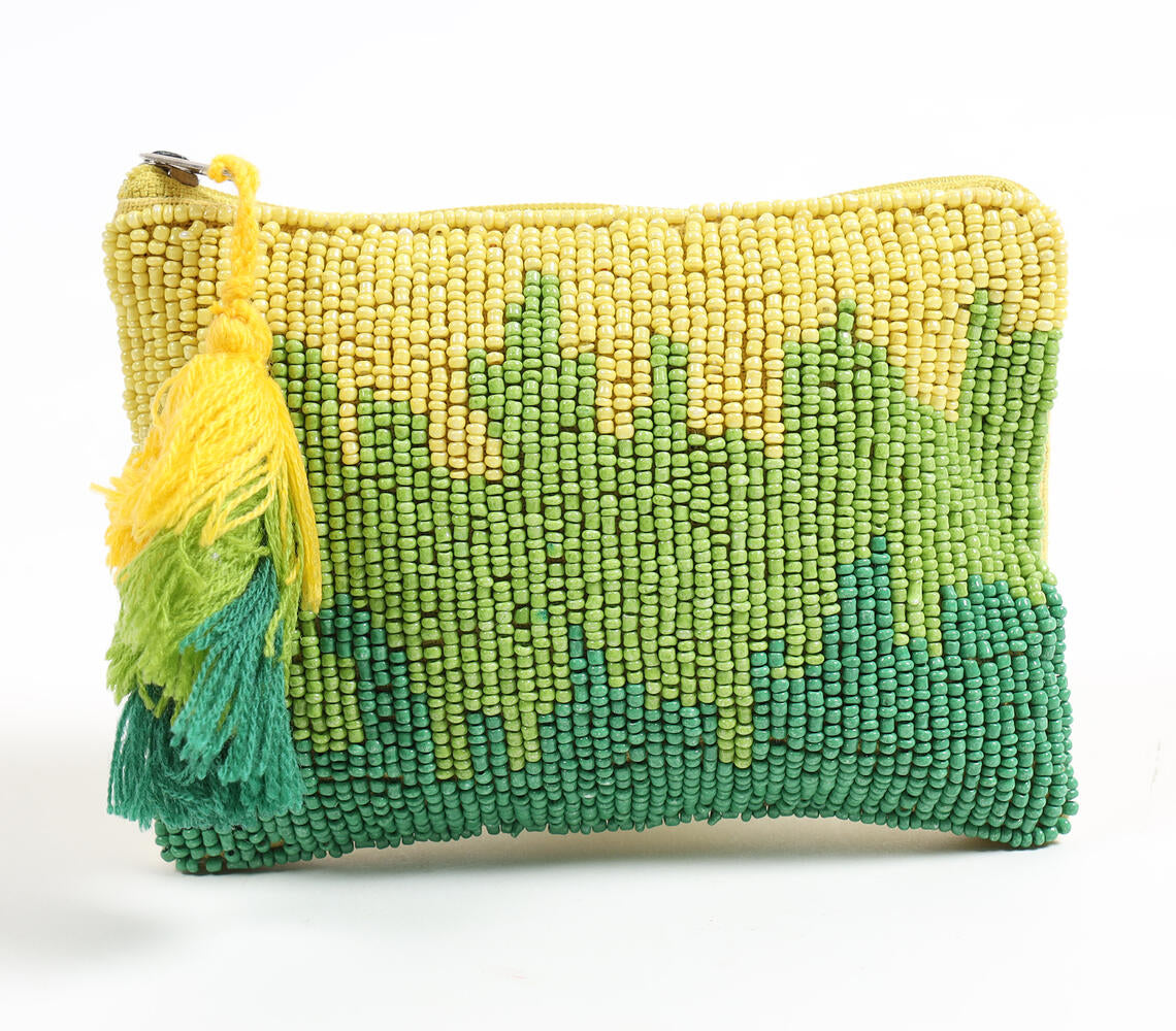 A bohemian chunky bead decoration and a botanical palette make this coin pouch a favorite for the...
