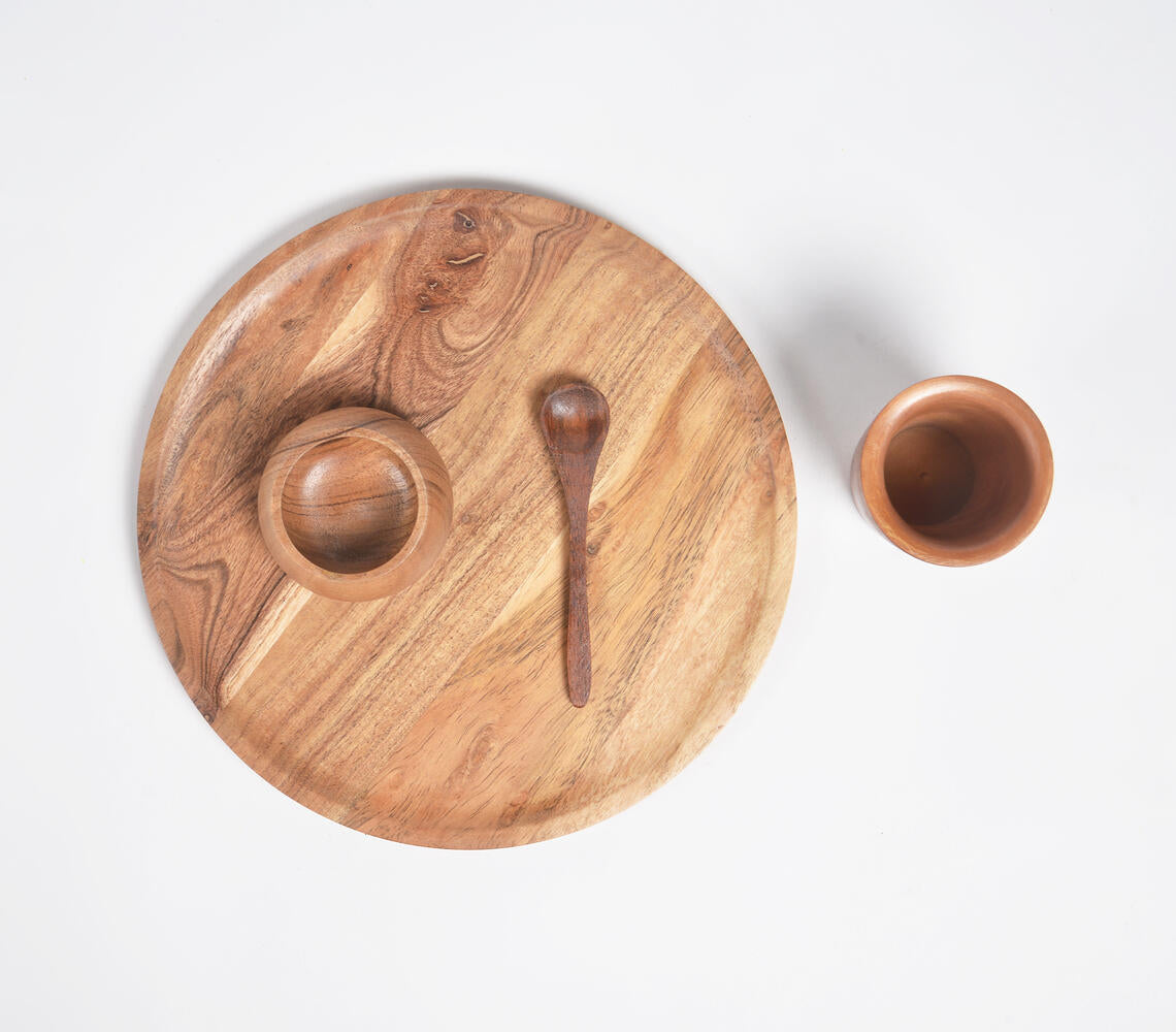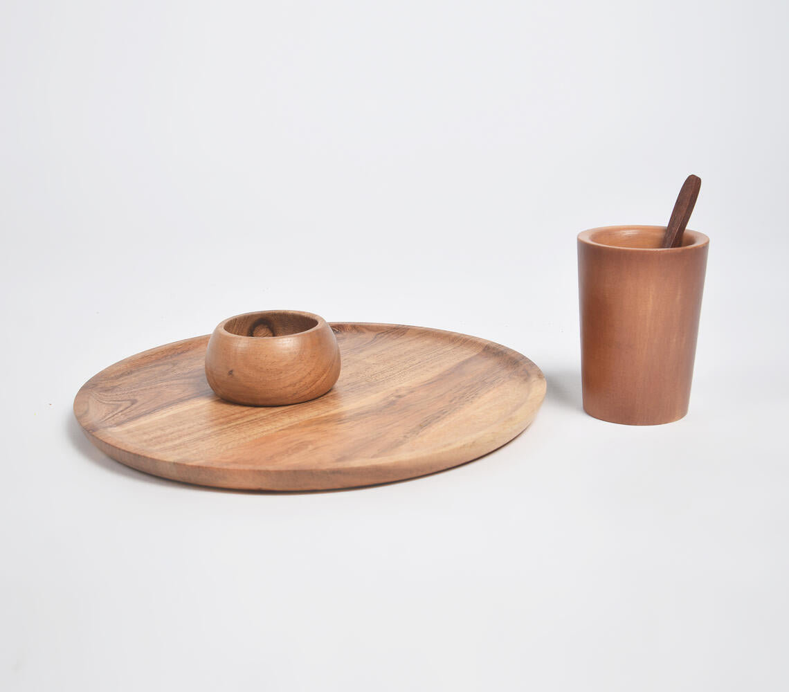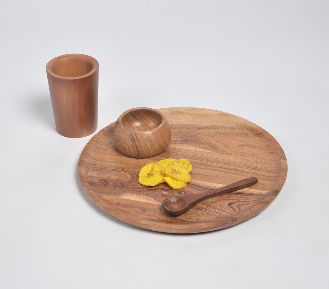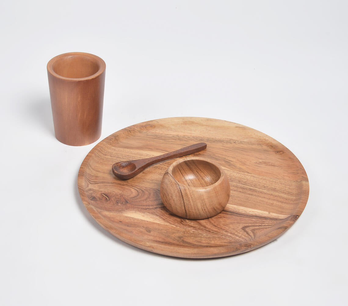 Hand Cut Acacia Wood Set of Plate, Spoon, Bowl & Glass