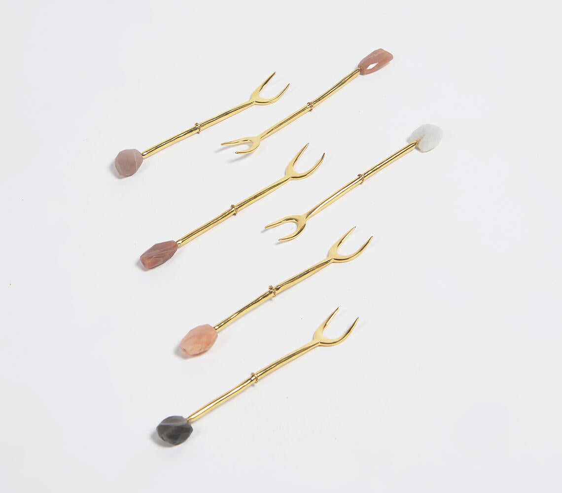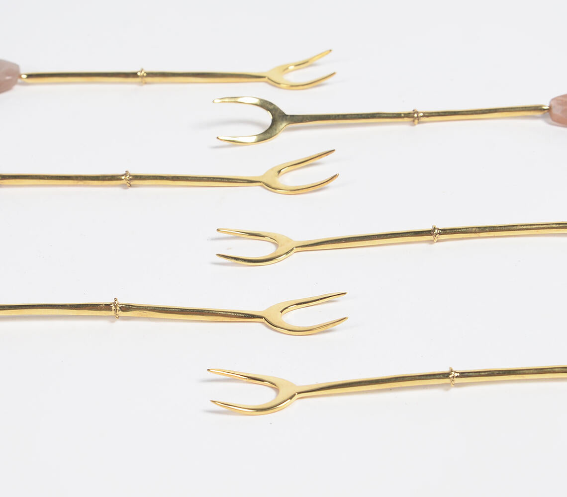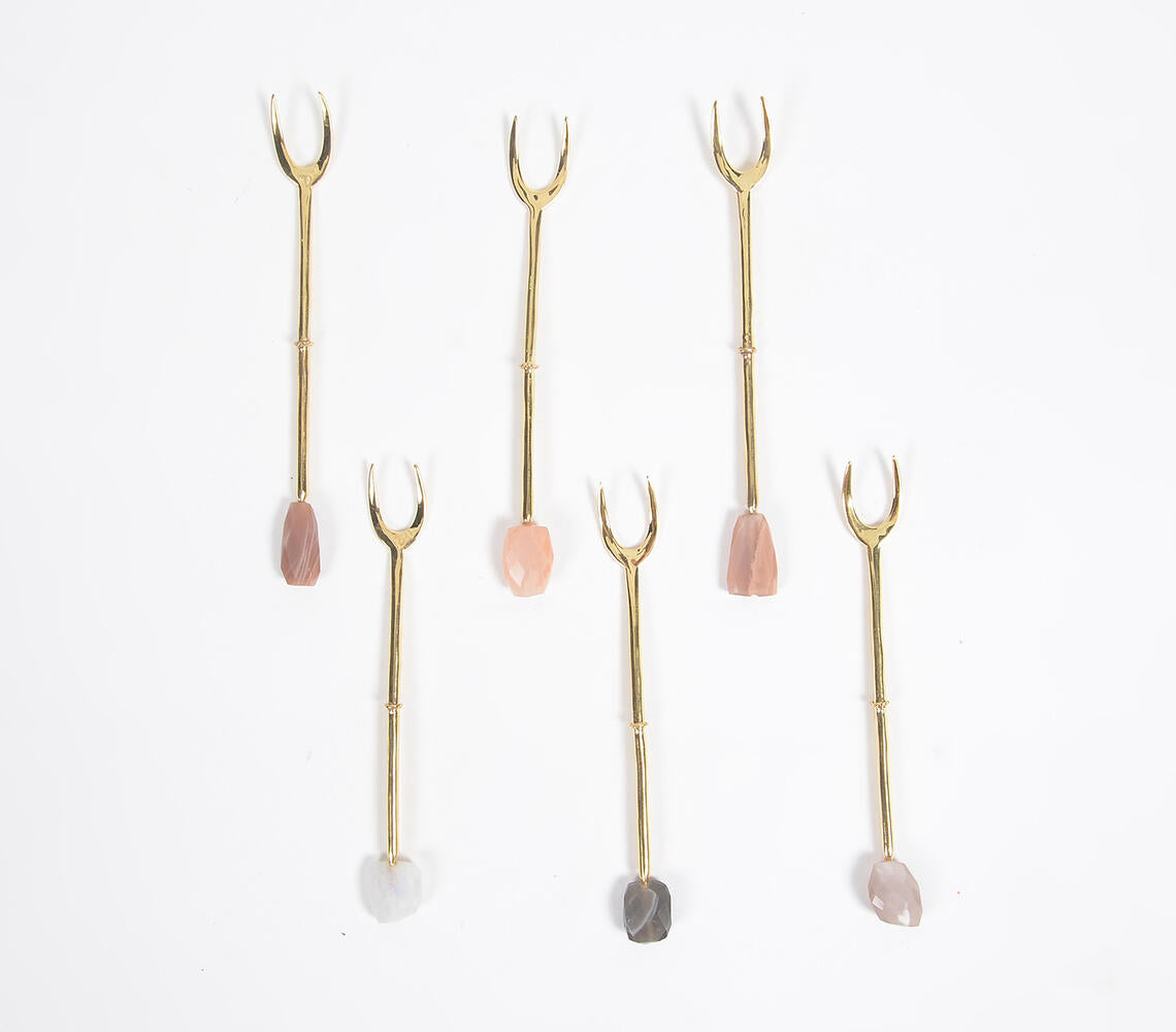 Hand Cut Moonstone & Brass Appetizer Forks (Set of 6)