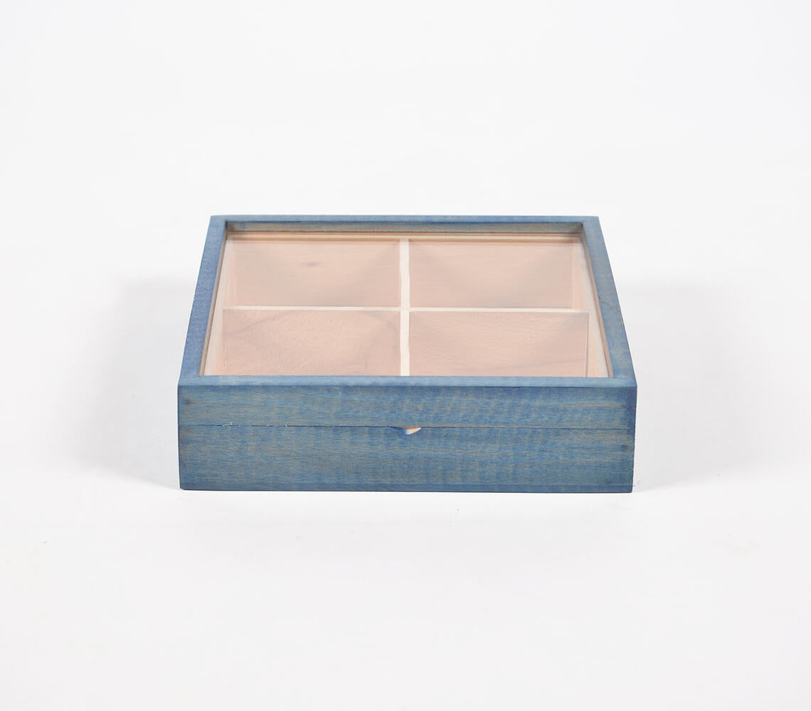 Hand Cut Steam Beech Wood Blue Jewelry Box - 4 Compartments