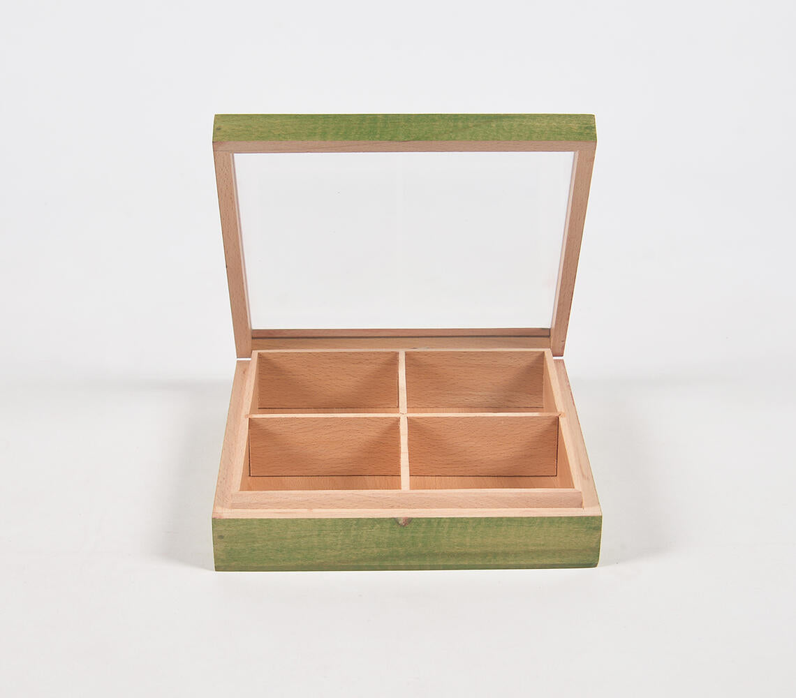 Hand Cut Steam Beech Wood Green Jewelry Box - 4 Compartments