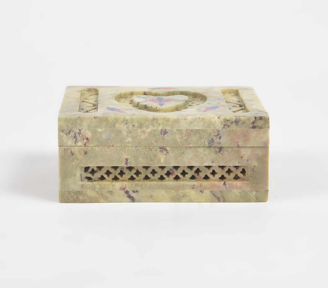 Inlaid Semi-Precious Stone & Lattice Cut Soapstone Jewelry Box 1
