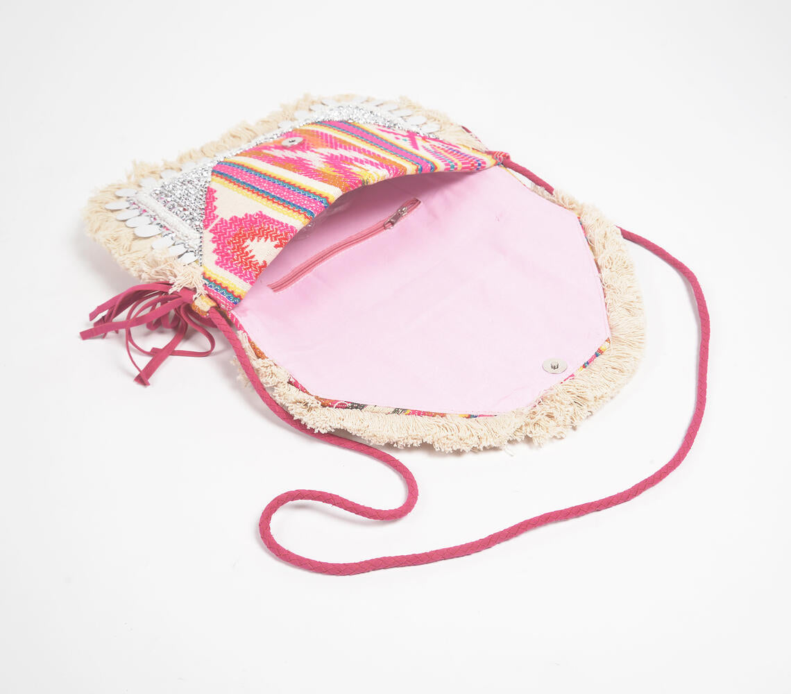 Sequin Embellished Fringed & Tasseled Sling Bag